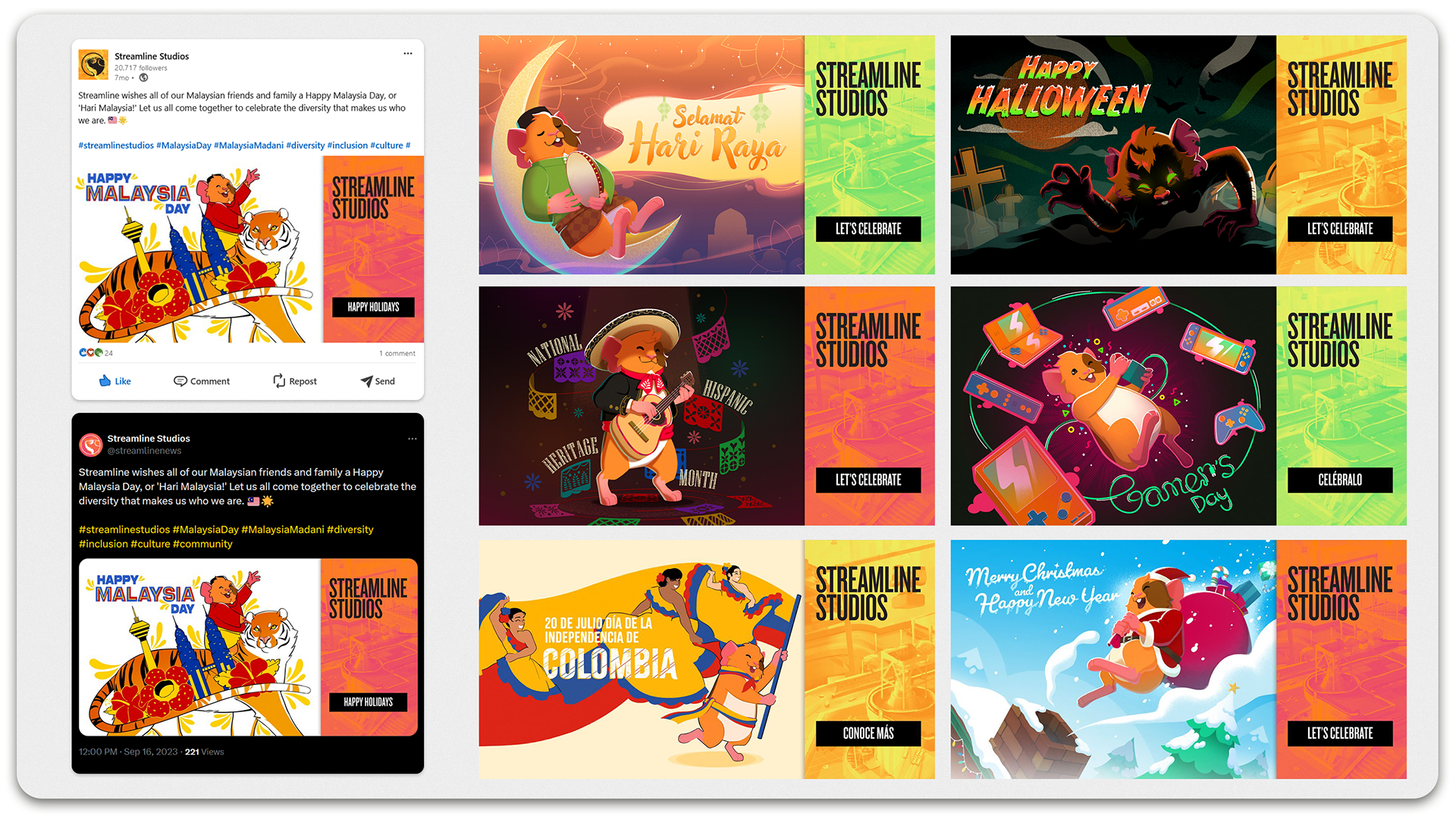 Illustrations featuring Streamline’s mascot, Leon. These illustrations represent Streamline’s diverse culture by celebrating holidays across the globe.